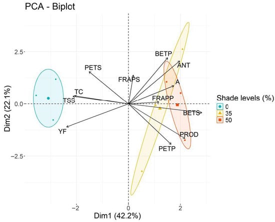 PC2 (22.1%) further differentiated the shaded treatments, with PETP, YF, and PROD contributing positively, while BETP, ANT, and PETS contributed negatively. The biplots exhibited a clear separation of shade levels in three categories corresponding to shade levels (0%, 35%, 50%), showing positive contributions of all global traits in explaining the variability when exposed to the treatments.