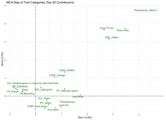 The eigenvalue table (Table 5) revealed that the first twenty MCA dimensions collectively accounted for 44.9% of the total variance, which represents the optimal balance capturing meaningful balance and interpretability. The MCA map of trait categories illustrated the primary associations driving the variations, with key traits grouping along the first two dimensions, as shown in Figure 2. The optimal number of clusters was determined to be two using the silhouette approach (Figure S2), with most accessions belonging to cluster 1 (n = 472), while cluster 2 formed a small distinct outlier group (n = 7) (Figure 3).