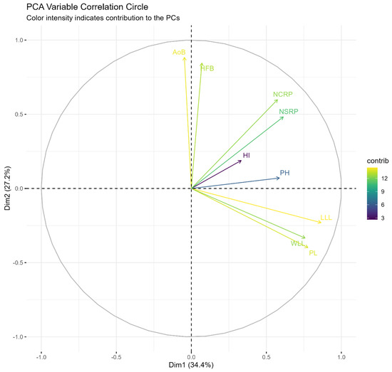 Scatter plot of first two dimensions from PCA correlation circle of quantitative traits. AoB: Angle of Branching; HFB: Height to first branching; NCRP: Number of commercial roots per plant; LLL: Length of leaf lobe; WLL: Width of leaf lobe. PL: Petiole Length; PH: Plant Height; NSRP: Number of storage roots per plant; HI: Harvest Index.