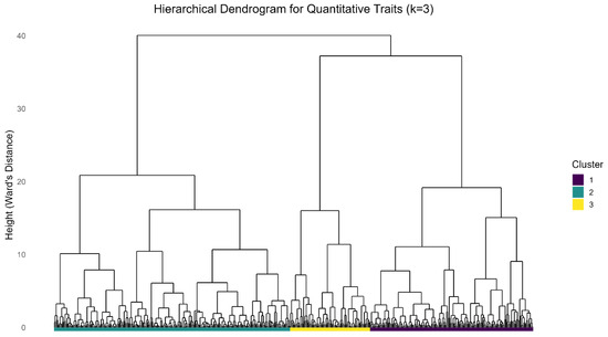 Hierarchical cluster analysis was performed on the scores of the first three PCs to partition the population into distinct morphological groups. The optimal number of clusters was objectively determined to be three (k = 3) using the average Silhouette width method (Figure S3). The resulting dendrogram visually confirmed a clear and balanced division of the accessions into these three groups (Figure 5). The dendrogram (Figure 5) illustrates how accessions are grouped according to genetic similarities in the measured quantitative characters with minimal environmental influence, as accounted for by the type of experimental design employed and statistical analysis. The final cluster composition was as follows: Cluster I contains 163 accessions, cluster 2 236 accessions, and cluster 3 80 accessions (Table 7). Significant differences were observed in the mean values for most of the traits evaluated, confirming an effective classification (Table 7). Accessions with higher angle of branching were recorded in cluster 1 with a mean of 45.730, while cluster 2 had the lowest angle of branching with a mean of 8.570; accessions in cluster 1 had higher heights to first branch with a mean of 75.45 cm, while accessions in cluster 2 were characterized by lower heights to first branching with a mean of 13.64 cm. The study reveals that cluster 2 had the highest mean (0.47) for harvest index and cluster 3 had the lowest mean (0.33); the highest length of leaf lobe was observed in cluster 2 with a mean of 16.77 cm while cluster 3 had the lowest length of leaf lobe with a mean of 11.67 cm. More commercial roots per plant (4 roots) were recorded in cluster 1 and cluster 3 had a lower number of commercial roots per plant (1 root). Cluster 1 had a higher number of storage roots with a mean of 7 roots, while cluster 3 had a lower number of storage roots with a mean of 3 roots. The highest plant height was recorded in cluster 2 with a mean of 239.52 cm, while cluster 3 had the shortest plant height with a mean of 186.83 cm. Cluster 2 accessions had the longest petiole length 26.17 cm, but cluster 3 had the shortest petiole length, mean 17.16 cm. Cluster 2 had the longest width of leaf lobe with a mean of 4.84 cm, but cluster 3 had the shortest width of leaf lobe at 3.60 cm.