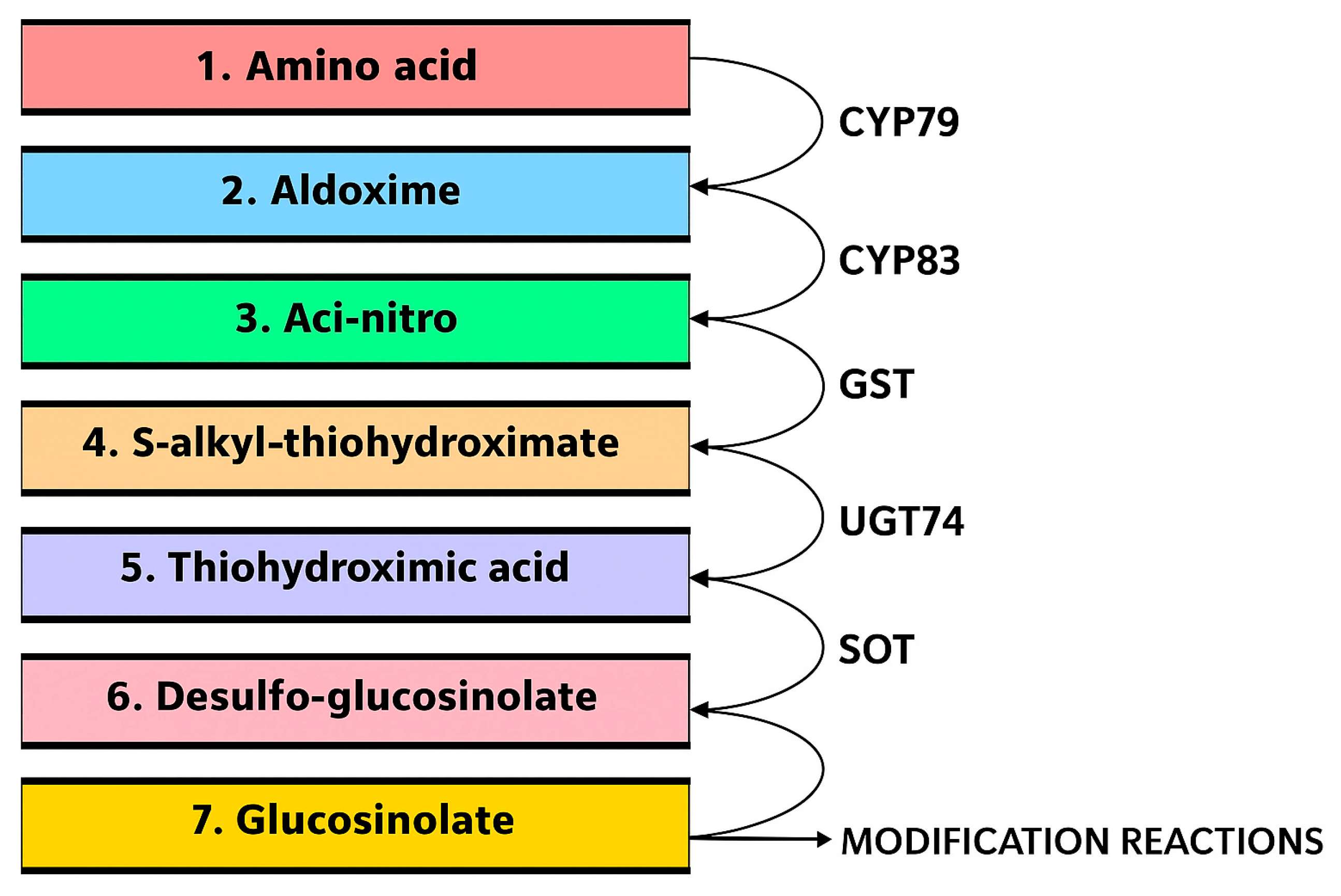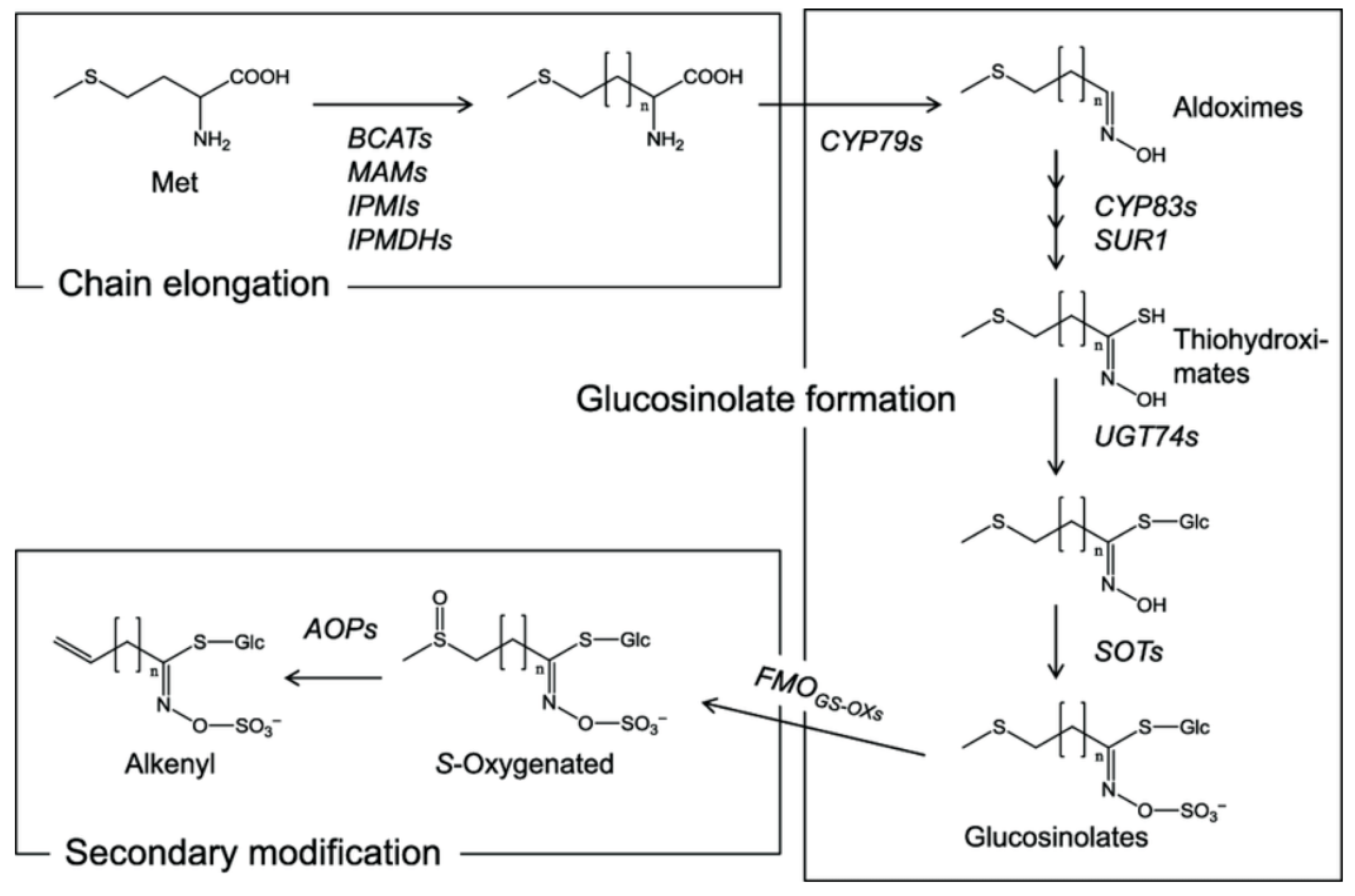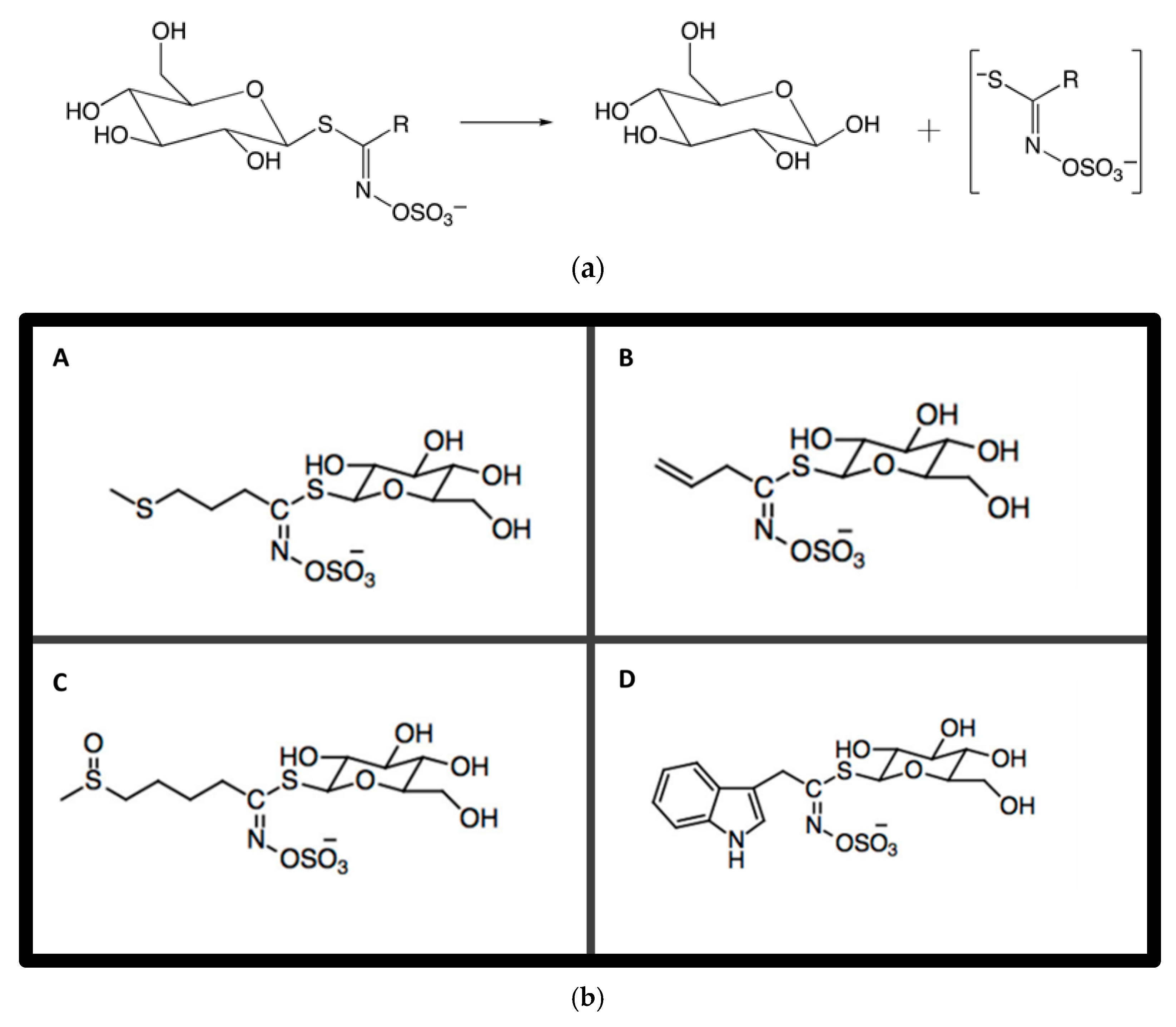 - Malhotra, B.; Bisht, N.C. Glucosinolates: Regulation of biosynthesis and hydrolysis. Front. Plant Sci. 2020, 11, 620965. [Google Scholar] [CrossRef]