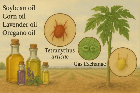 In the in vitro mortality assay of T. urticae adults, treatments based on corn oil, soybean oil, and lavender essential oil proved to be as effective as abamectin within 24 h post-application. Among these, soybean oil was the least harmful to adults of the beneficial predatory mite Amblyseius swirskii. Additionally, while the synthetic pesticide negatively impacted gas exchange variables, biorational treatments had no adverse effects; in fact, lavender oil even enhanced photosynthetic capacity, contributing to improved plant physiological performance.