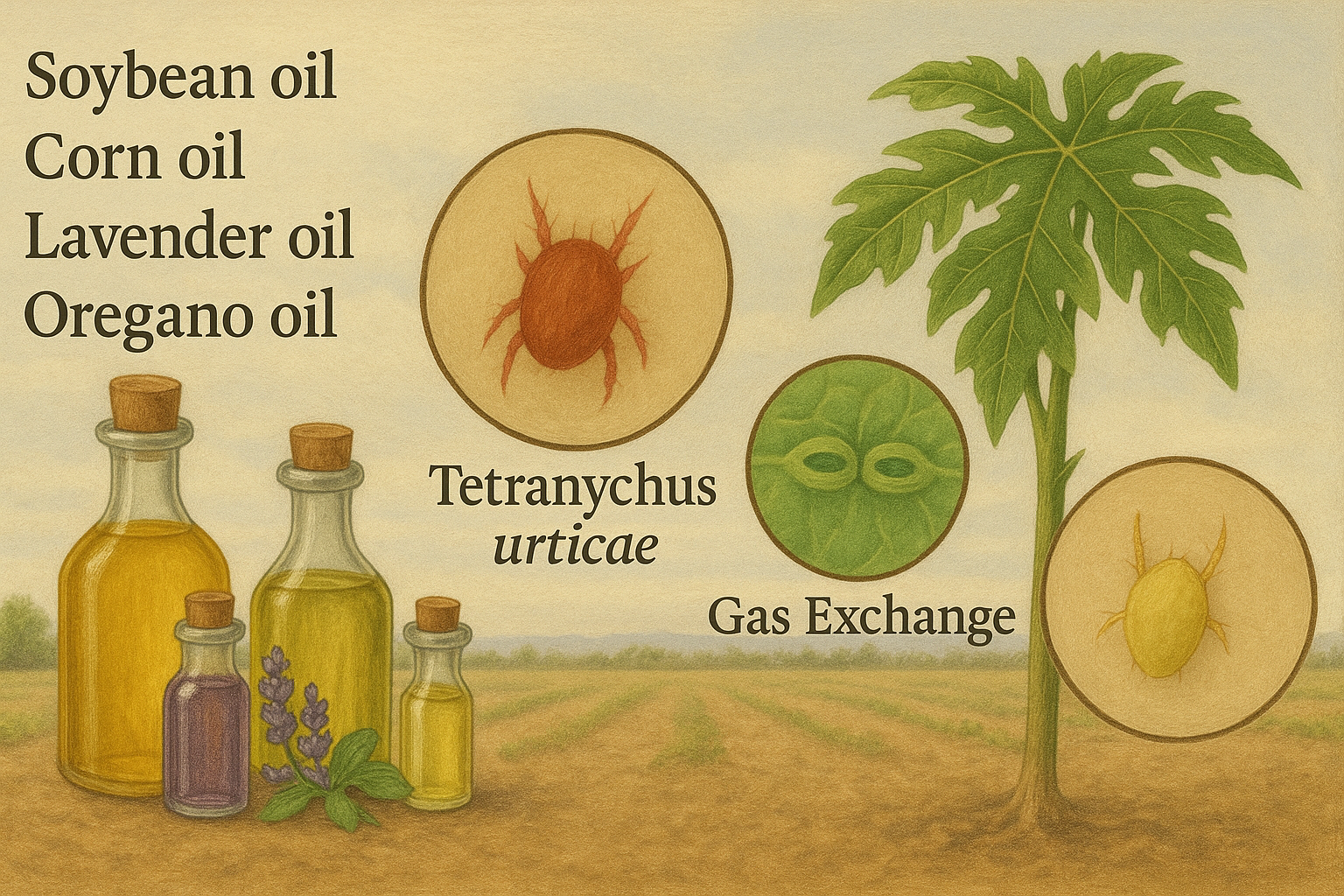 In papaya seedlings, research on botanical oils remains limited, as most available studies have focused on detached leaves or adult plants. Few reports simultaneously evaluate pest suppression, impacts on predatory mites, and plant physiological responses under nursery conditions, leaving a gap in understanding how these formulations perform during early crop development. Thus, this study addresses three key questions: (i) What is the effect of botanical oils on Tetranychus urticae under laboratory and field conditions? (ii) How do these formulations affect the predatory mite Amblyseius swirskii? (iii) What are the consequences of their application for gas exchange in papaya seedlings? Therefore, the objective of this study was to evaluate the effects of botanical oils on gas exchange in papaya seedlings and on the mortality of T. urticae and A. swirskii.