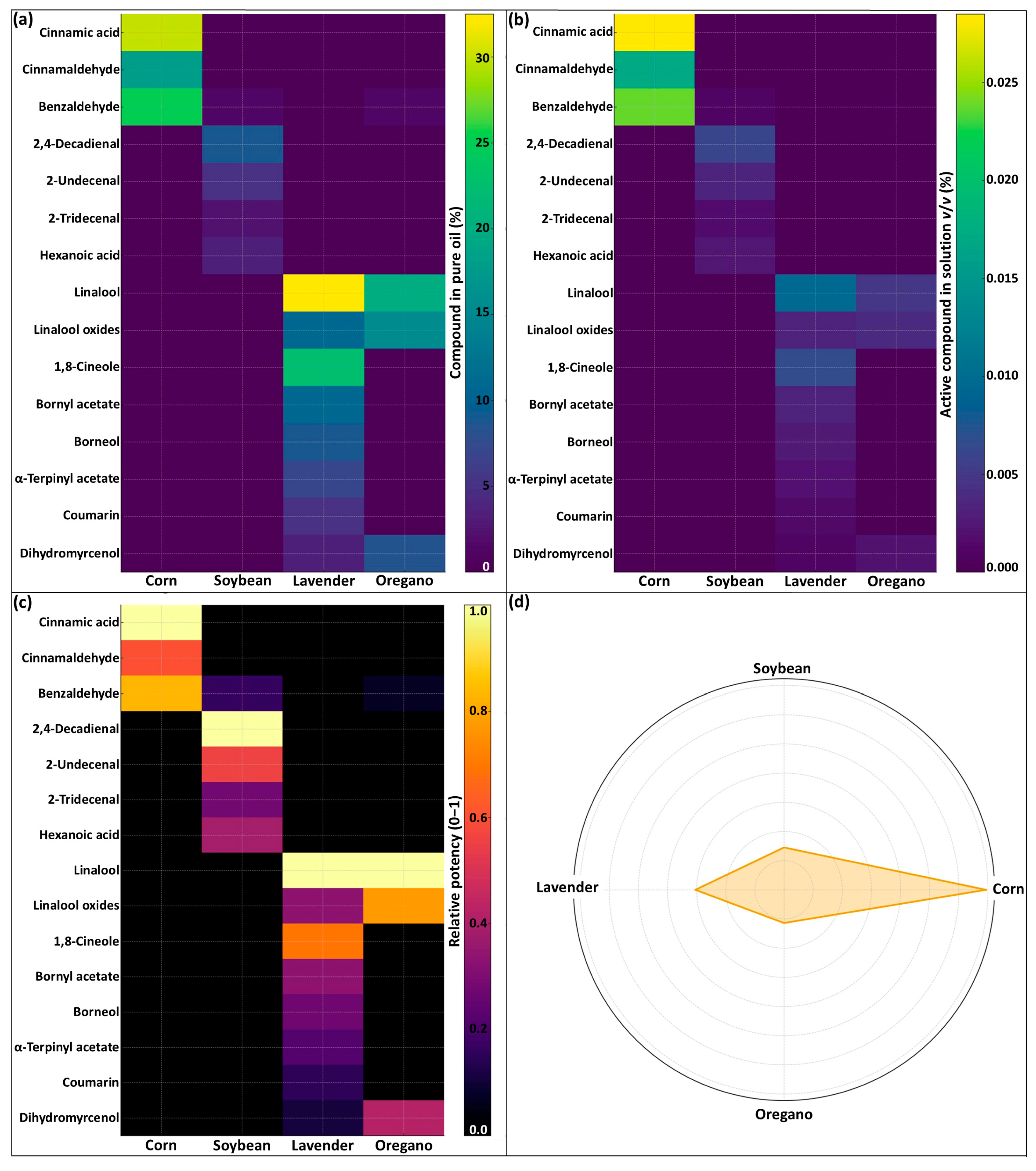 3]. Corn oil, rather than being rich in fatty acids, was characterized by cinnamic acid, cinnamaldehyde, benzaldehyde, and 2,4-decadienal, while soybean oil exhibited uniformly weak signals across all compounds, consistent with its limited volatile profile. After adjusting these constituents to the application dose, corn oil delivered the highest chemical load per liter, lavender and oregano contributed intermediate loads, and soybean oil consistently showed the lowest chemical load per liter.