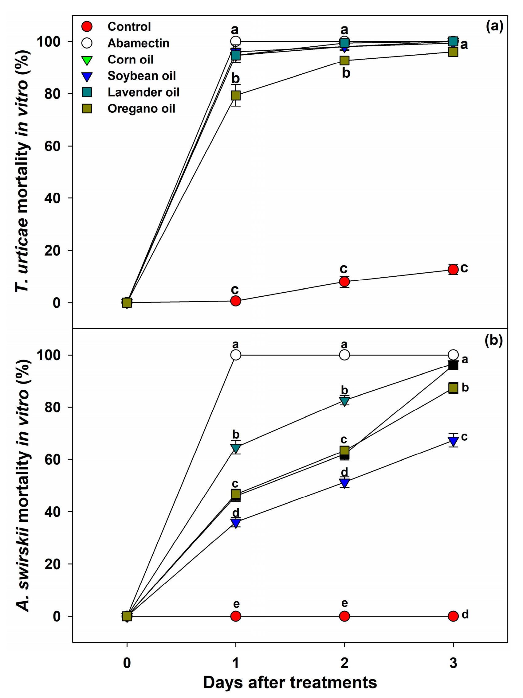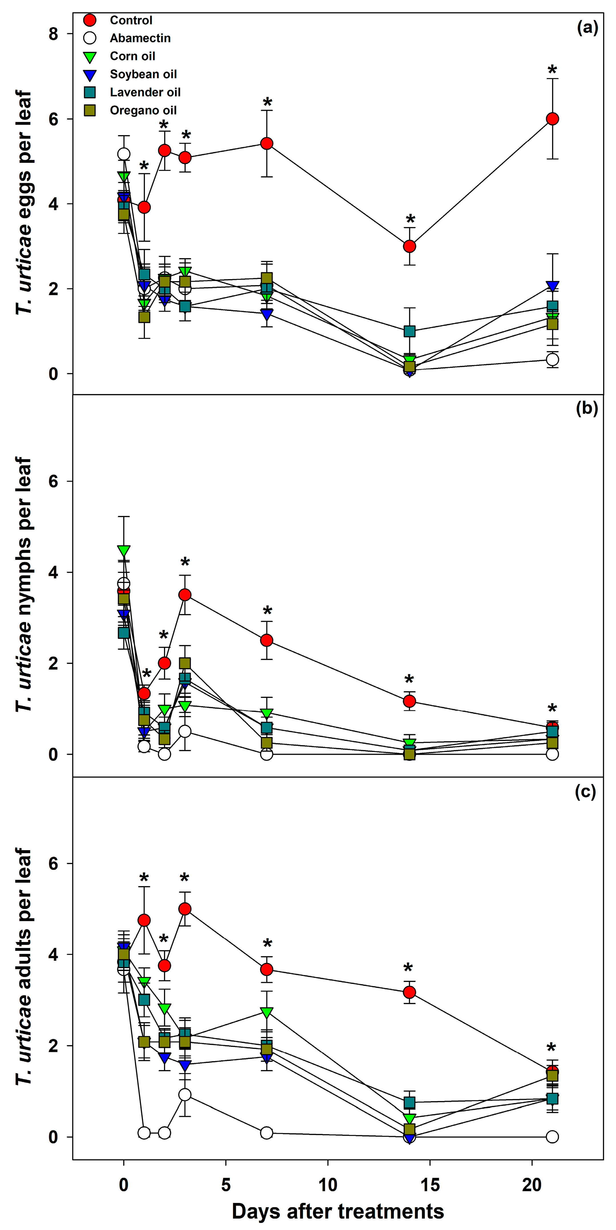 26] have reported that treatments with soybean oil, corn oil, and lavender oil are more effective against adult mites than against eggs or nymphs. This difference in efficacy is attributed to their contact toxicity, which predominantly affects the nervous system of adult mites.