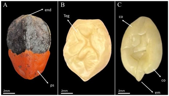 Pyrene of Commiphora leptophloeos (Mart.) J.B. Gillett. (A) External view of the pyrene, showing the presence of the red pseudoaril in the basal region (ps) and the woody endocarp (end). (B) Seed with adherent testa (teg). (C) Seed without testa, showing the cotyledons (co) and the embryo (em).