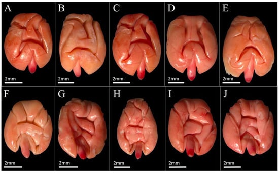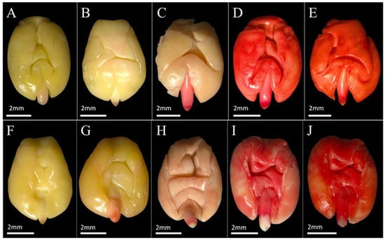 Tetrazolium staining pattern in viable seeds of Commiphora leptophloeos (Mart.) J.B. Gillett (Burseraceae). (A–E): dorsal views; (F–J): ventral views. All images illustrate viable embryos, characterized by uniform carmine-red coloration of the embryo and cotyledons. Letters identify different individual seeds and do not represent distinct viability classes or treatments. Scale bar = 2 mm.