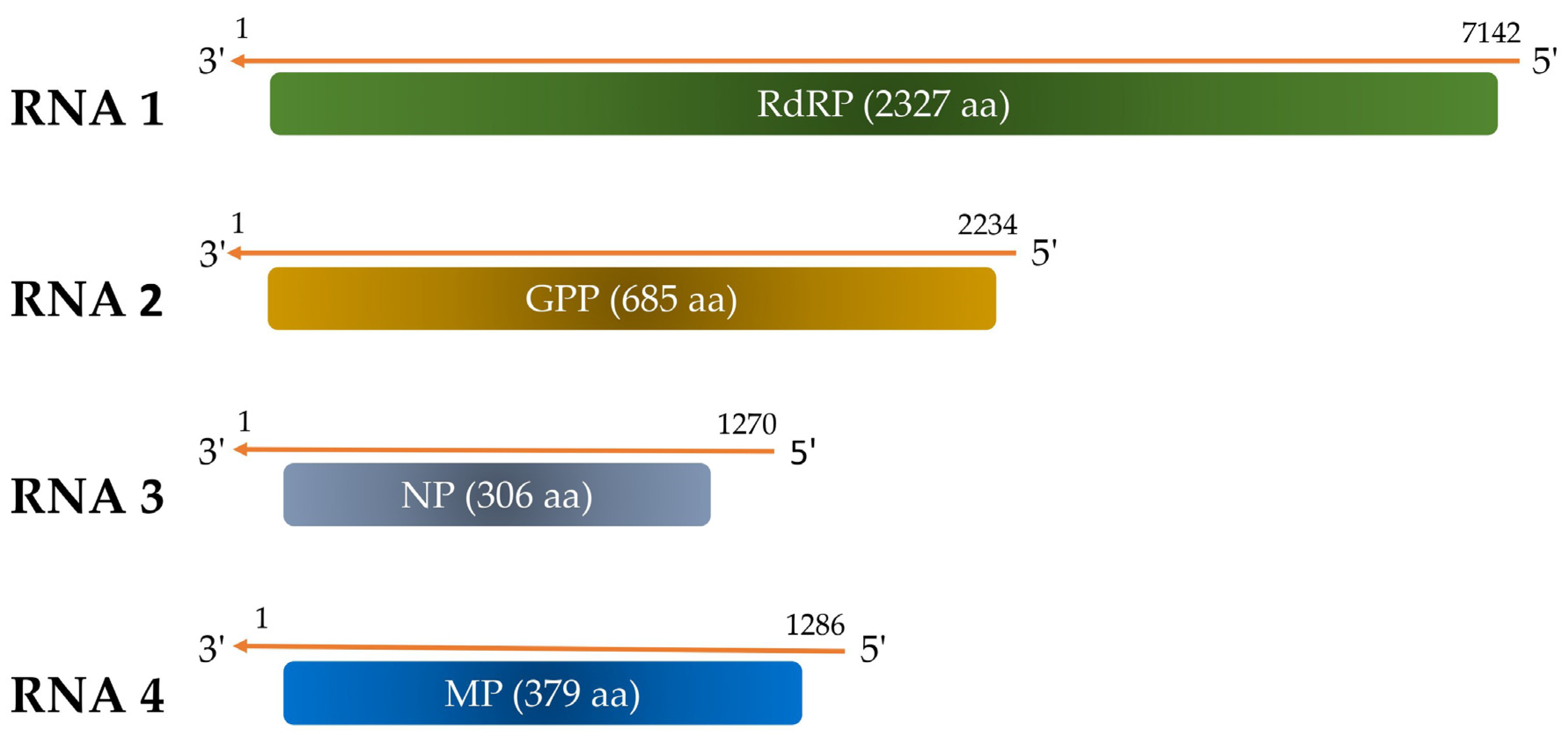 - Digiaro, M.; Elbeaino, T.; Kubota, K.; Ochoa-Corona, F.M.; von Bargen, S. ICTV Virus Taxonomy Profile: Fimoviridae. J. Gen. Virol. 2024, 105, e001943. [Google Scholar] [CrossRef] [PubMed]