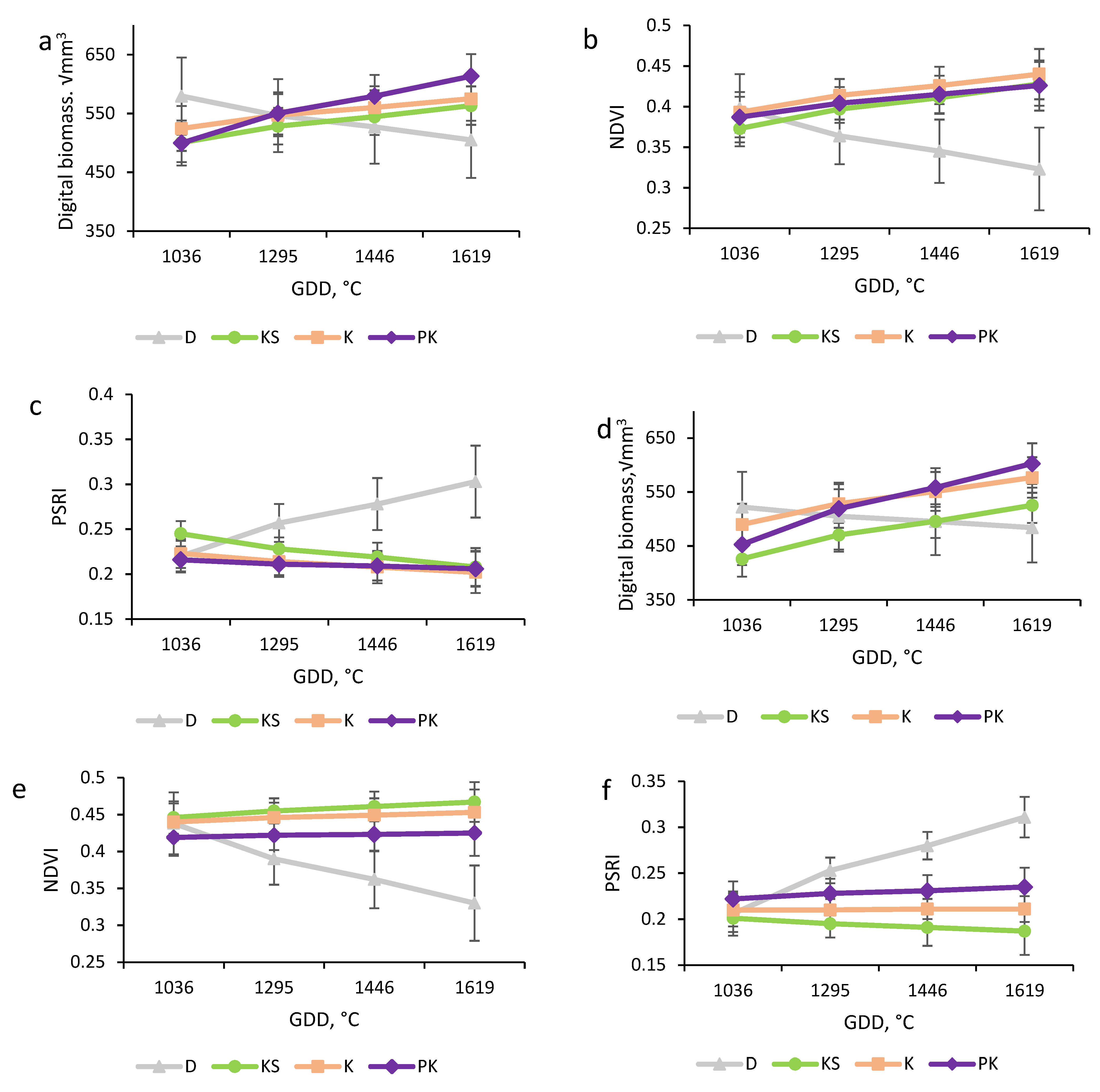 - The final model for each index was selected based on the lowest Akaike Information Criterion (AIC) and successful fulfillment of parametric assumptions. This resulted in: a square-root transformed LMM with an AR(1) correlation structure for digital biomass; an untransformed LMM for NDVI; and a Yeo-Johnson transformed LMM for PSRI.