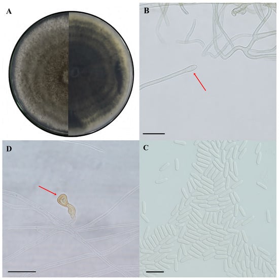 C. fructicola. (A) Upper and lower views of colonies grown on potato dextrose agar (PDA) and incubated at 28 °C for seven days; (B) conidiophores (red arrow); (C) conidia; (D) appressoria (red arrow). Scale bars: 1 mm (A), 20 µm (B,D), 50 µm (C).