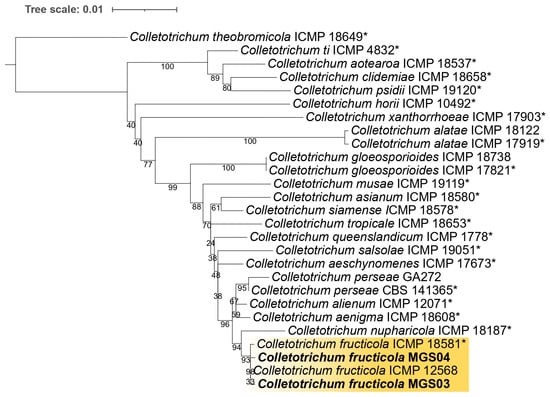 In this study, two isolates obtained from symptomatic leaves (MGS03 and MGS04) displayed cultural and morphological traits consistent with the C. fructicola species complex as described by Weir et al. [10].
