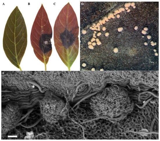 Pathogenicity test of C. fructicola. (A) Non-inoculated leaf; (B) leaves inoculated with mycelial disks; (C) leaves inoculated with conidial suspension; (D) presence of reproductive structures (conidial masses); (E) conidial masses observed by SEM, Scale bar = 30 μm.