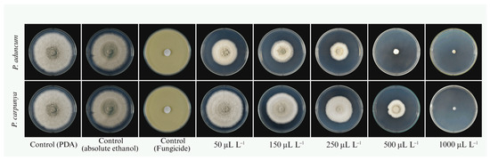 The in vitro inhibition assay revealed that both P. aduncum and P. carpunya essential oils (EOs) significantly inhibited the mycelial growth of C. fructicola in a clear dose-dependent manner (Table 2; Figure 5). At lower concentrations (50–150 µL L−1), inhibition was moderate and remained below 30% for both EOs. At 250 µL L−1, P. aduncum exhibited a markedly stronger inhibitory effect (58.2%) than P. carpunya (23.9%). A sharp increase in antifungal activity was observed from 500 µL L−1 onward, with P. aduncum achieving inhibition values close to 90%, while P. carpunya reached approximately 57%. At the highest concentration (1000 µL L−1), both essential oils completely inhibited fungal growth, reaching 100% inhibition. Overall, P. aduncum consistently showed higher antifungal potency than P. carpunya across all tested concentrations.