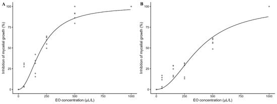 Effects of different concentrations of essential oils from Piper aduncum (A) and P. carpunya (B) on mycelial growth of Colletotrichum fructicola. Dose–response curves fitted using logistic model.