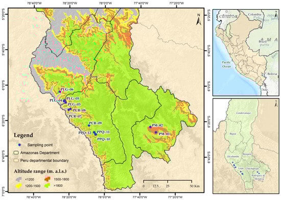 Twelve square plots of 1 ha (100 m × 100 m) were established within agroforestry systems combining coffee plantations older than three years with forest tree species. Plots were distributed across three altitudinal gradients: 1200–1500 m.a.s.l. (four plots in Utcubamba Province), 1500–1800 m.a.s.l. (two plots in Luya Province and two in Rodríguez de Mendoza Province), and 1800–2000 m.a.s.l. (four plots in Luya Province) (Table 1).