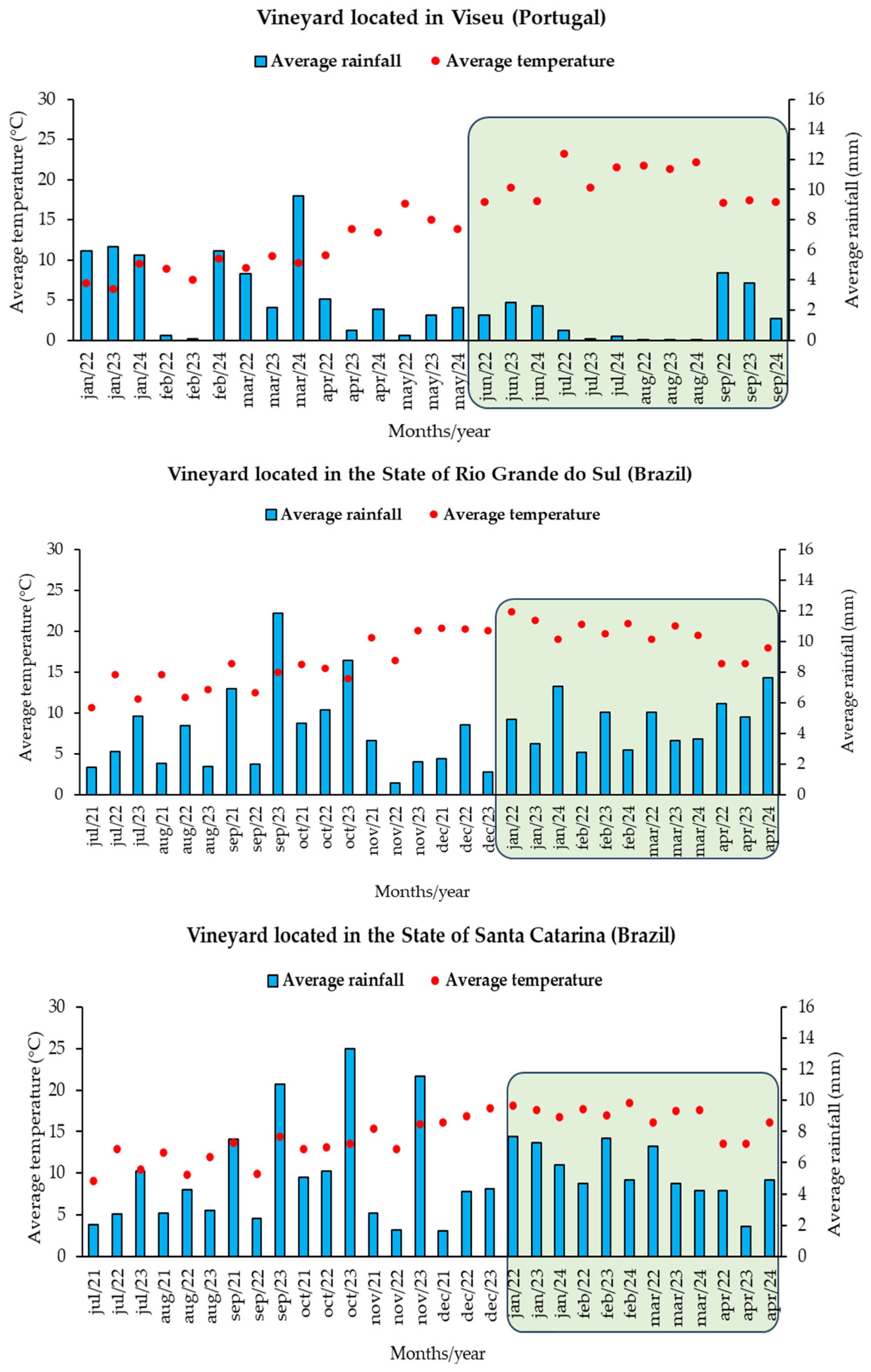 - Rouxinol, M.I.; Martins, M.R.; Salgueiro, V.; Costa, M.J.; Barroso, J.M.; Rato, A.E. Climate effect on morphological traits and polyphenolic composition of red wine grapes of Vitis vinifera. Beverages 2023, 9, 8. [Google Scholar] [CrossRef]