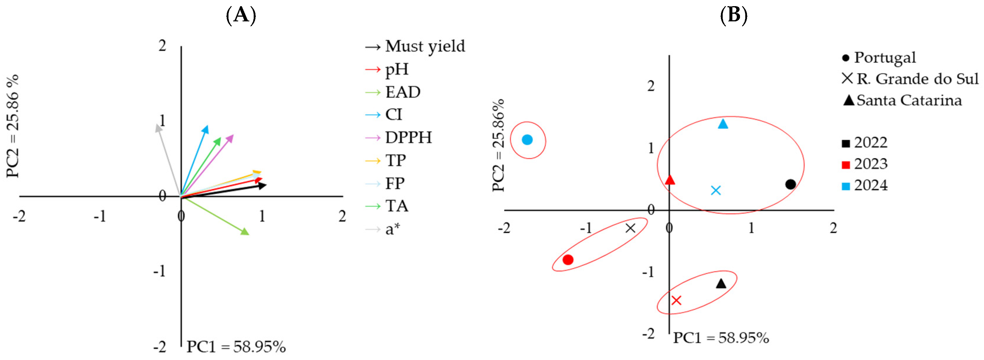| pH | 2022 | Portugal | 3.84 ± 0.01 Ac | 3.86 ± 0.01 Ac | 4.00 ± 0.00 Ab | 4.07 ± 0.01 Aa | 4.10 ± 0.01 Aa |