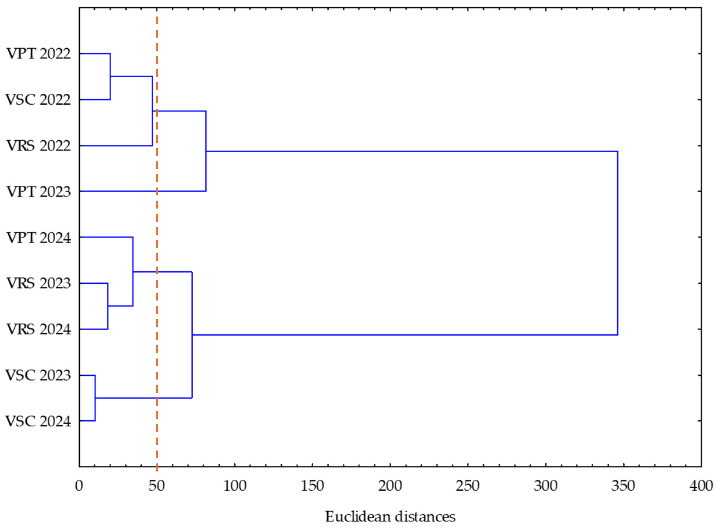 - Muniz, J.N.; Simon, S.; Brighenti, A.F.; Malinovski, L.I.; Panceri, C.P.; Vanderlinde, G.; Welter, J.; Dal Zotto, D.; Silva, A.L.D. Viticultural performance of ‘Merlot’ and ‘Cabernet Sauvignon’ (Vitis vinifera L.) cultivated in high altitude regions of southern Brazil. J. Life Sci. 2015, 9, 399–410. [Google Scholar] [CrossRef]
