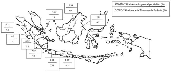Moreover, the prevalence of thalassemia, including those undetected, silent carriers, seems to protect the host from COVID-19. In regions where there is high prevalence of thalassemia, it is rational to hypothesize that the number of thalassemia minor or silent carriers is also higher. From Figure 1, we can obtain data regarding the proportion of COVID-19 in general population compared to in thalassemia patients. In most regions of Indonesia, the incidence of COVID-19 in thalassemia patients is generally lower than general population. However, we also found that there are some provinces with higher COVID-19 incidence in thalassemia compared with the general population. This is caused by the low number of registered thalassemia patients compared to other regions, thereby increasing the percentage of thalassemia patients affected by COVID-19 at the specific area due to the smaller denumerator.