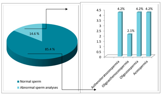 Spermogram prior to chemotherapy was performed in 48 of the HL patients who had complete results available for statistical evaluation. Among them, normal findings were reported in 85.4% (41 pts), while in 14.6% (7 pts) of the patients, abnormalities in the spermogram were found. Asthenoteratozoospermia, oligozoospermia or azoospermia were documented in 4.2% of these patients. In one patient, oligoasthenozoospermia was found (Figure 1).