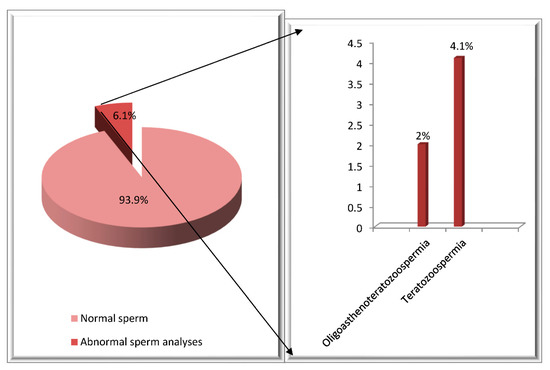 Following therapy, a spermogram was performed in 49 HD patients treated with ABVD. This group had an average age of 24.8 years, ranging from 15 to 43 years. In 93.9% (46 pts) of these patients, the spermogram result was normal, and 6.1% (3 pts) of patients following treatment with ABVD developed abnormalities. Teratozoospermia was documented in 4.1% of the patients and oligoasthenoteratozoospermia in one patient (Figure 2).