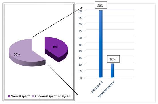 Among these patients, 40% (4 pts) had normal findings, while 60% (6 pts) manifested abnormalities following treatment. In five of these patients, azoospermia was documented, while one patient had astenozoospermia (Figure 3).
