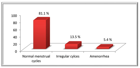 Following ABVD treatment, out of the total of 74 patients evaluated, 81.1% (60 pts) of the patients remained with a regular cycle, in 13.5% (10 pts) time irregularities in the cycle were reported and in 5.4% (4 pts) of the patients the cycles had ceased (Figure 4).