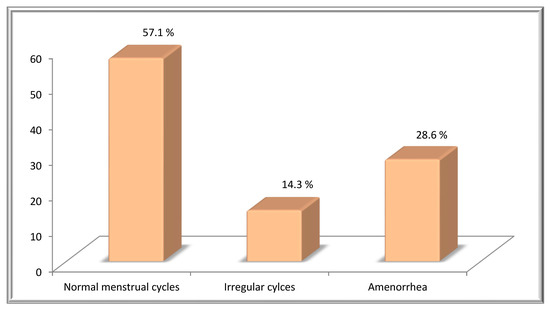 Seven female HD patients, treated with BEACOPP chemotherapy were analyzed, all of them stating that their periods were regular prior to treatment. Following BEACOPP therapy, 57.1% (4 pts) remained with a regular cycle, 14.3% (1 pt) developed irregularities regarding time (variations in occurrence and/or duration) and 28.6% (2 pts) reported cessation of the cycle (Figure 5).