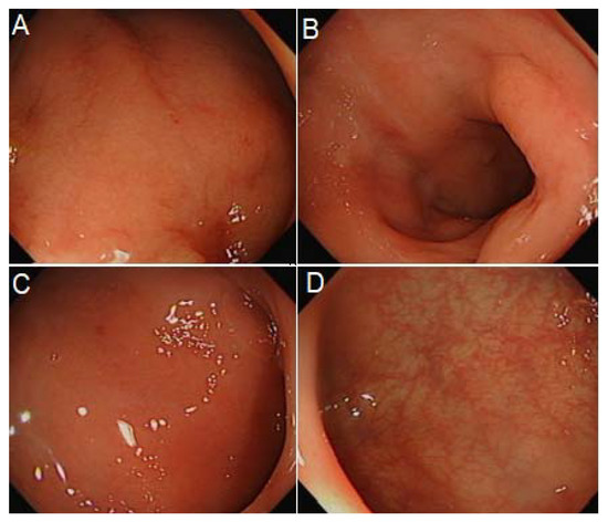 From rectum to splenic flexure (A–D): findings of proctocolitis, however, improved compared with previous sigmoidoscopy.