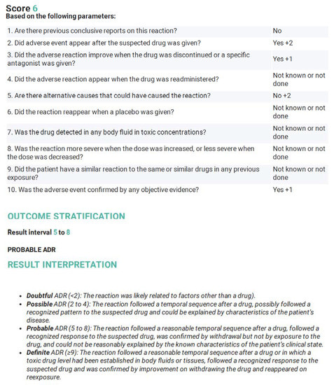Naranjo Adverse Drug Reaction Probability Scale (Taken and adapted from www.evidencio.com/models/show/661, accessed on 8 March 2022).
