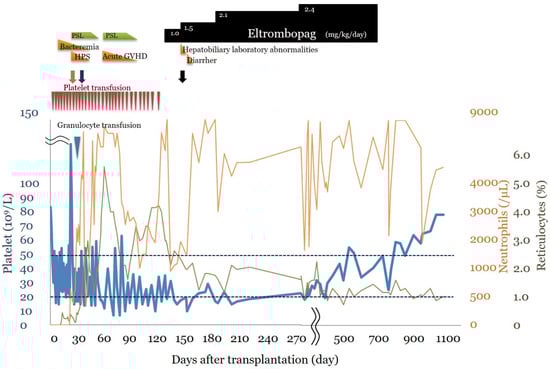 Prolonged isolated thrombocytopenia (PIT) is defined as a condition in which platelet counts do not exceed 20 × 109/L at 60 days after hematopoietic cell transplantation or when the patient remains transfusion dependent despite achieving neutrophil and reticulocyte engraftment after the procedure; PIT is a complication that occurs in 5–30% of patients undergoing allogeneic hematopoietic cell transplantation []. Standard therapies for PIT have not yet been established; currently, platelet transfusions are recommended to prevent serious bleeding []. However, frequent long-term transfusions adversely affect safety and quality of life []. Particularly in children, the course after transplantation is long, and frequent blood transfusions can become a serious issue []. In adults, the efficacy of eltrombopag, a 2nd generation thrombopoietin receptor agonist (TPO-RA), against PIT has been reported as a curative alternative to blood transfusions. In children, eltrombopag has been shown to be effective against idiopathic thrombocytopenic purpura (ITP) and aplastic anemia (AA) [,]; however, few studies have reported the use of eltrombopag for PIT. Here, we report our experience with a pediatric patient with congenital pure red cell aplasia (Diamond–Blackfan Anemia, DBA) who was administered eltrombopag for the onset of PIT after allogeneic hematopoietic cell transplantation. We found that long-term administration of eltrombopag was effective and safe to a certain extent.
