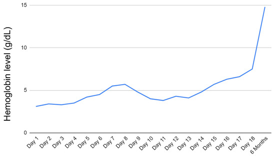 Upon outpatient follow-up, the patient reported feeling well with mild fluid retention improving on furosemide. He was started on a prednisone taper beginning at 70 mg and decreased by 10 mg weekly. Including rituximab infusions given as inpatient, the patient received a total of 4 cycles. Additionally, his immunosuppression was transitioned from tacrolimus to cyclosporine by his cardiologist. Hemoglobin approximately 5 months after discharge was 14.8 g/dL. The trend and improvement of hemoglobin are shown in Figure 1.