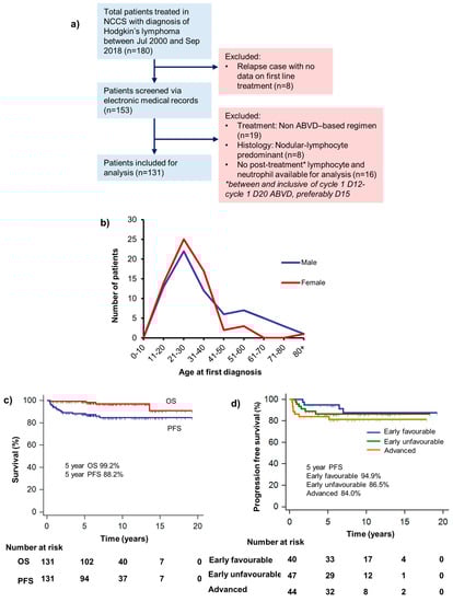 (a) Consort diagram illustrating our study design and patient selection process. (b) Age distribution of male and female patients in our cohort at first diagnosis. Incidence of Hodgkin’s was bimodal in our patient population, similar to previous studies. (c) Overall survival and progression-free survival in our cohort of patients with Hodgkins’ lymphoma. (d) Progression-free survival stratified by German Hodgkin Study Group (GHSG) stage. Note that PFS for all stages is excellent, with 81.3% 10-year PFS for GHSG advanced Hodgkin’s’ patients.