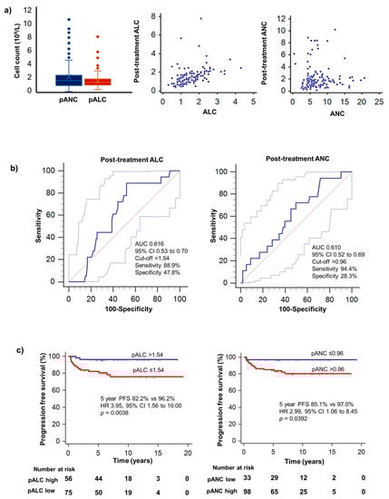 (a) Distribution of pALC and pANC in our cohort, and scatter plot illustrating correlation of pre- and post-treatment ALC and ANC. (b) Optimal cut-off values for stratification of low pALC (≤1.54) and high pANC (>0.96) were determined via receiver operating curve analysis. Dotted lines represent 95% confidence interval for sensitivity and specificity. (c) PFS stratified by pALC and pANC. High pALC (>1.54) and low pANC (≤0.96) were correlated with better progression-free survival.