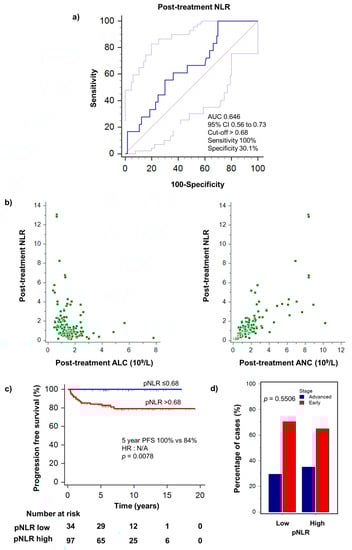 (a) Optimal cut-off value for high pNLR (>0.68) was determined by receiver operating curve analysis. (b) Correlation of post-treatment NLR with post-treatment ALC (rho = −0.474, p < 0.0001) and ANC (rho = 0.804, p < 0.0001). (c) PFS stratified by high/low pNLR. Low pNLR ≤ 0.68 was significantly associated with better progression-free survival. Remarkably, PFS was 100% in the low pNLR cohort. (d) pNLR did not correlate with disease stage.