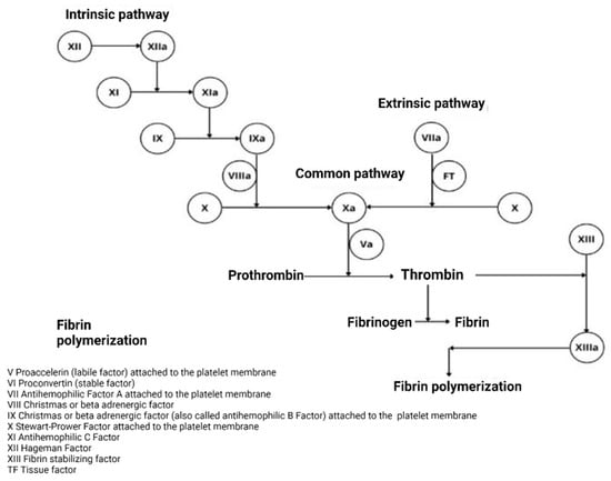 Two pathways in the coagulation cascade were considered: the intrinsic pathway—factors present in the blood—and the extrinsic pathway, in which an external tissue factor (TF) was required to initiate activation. These converge in the common pathway after activation of the FXa. The main factor in the generation of factor IIa (Prothrombin) is the FXa factor, which is generated in the two pathways called tenses (FX enzyme). The presence of the cofactors FVIIIa and FVa is essential, as can be seen in Figure 1 [2,4].