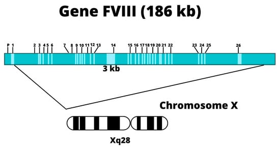 Structure of the FVIII gene. Note: Location of coagulation factor VIII on the X chromosome, taken from the Molecular Basis of Haemophilia [23]. Adapted from Sarmiento Doncel, S, et al. using the BioRender tool.