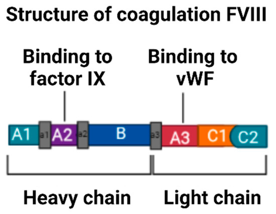 The mature protein of FVIII is composed of a heterodimer with two chains composed of three homologous A domains, a single B domain, and two homologous C domains that are in the order (A1-A2-B) heavy chain and (A3-C1-C2) light chain [24], from the amino terminus to the carboxyl terminus [14], as is evident in Figure 4. The domains are of vital importance in the function of FVIII because each one contains specific binding sites for components of the coagulation cascade [14].