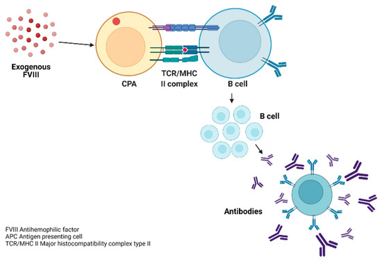 The recognition of the complex (FVIII and MHC II antigens) occurs through the T-lymphocyte receptor (TCR) and CD45. This binding of the receptor to the antigen (Ag) is not generated in an isolated manner since it requires co-stimulatory pathways (ligand complex), the receptors necessary for lymphocyte activation and regulation. From these interactions of lymphocyte subpopulations, the production of antibodies against FVIII is generated through the final differentiation of B lymphocytes into plasma cells, which secrete large amounts of the antibody, as shown in Figure 5. These generated antibodies are generally IgG4 polyclonal and, in some cases, IgG1 [29].