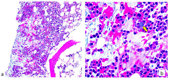 Bone marrow biopsy section showing (a) metastatic adenocarcinoma in the form of signet ring cells admixed within a background of bone marrow hemopoietic elements (b) Higher magnification showing signet ring carcinoma cells (pointed by yellow arrow) (H&E stain; (a): 100× magnification; (b): 400× magnification).