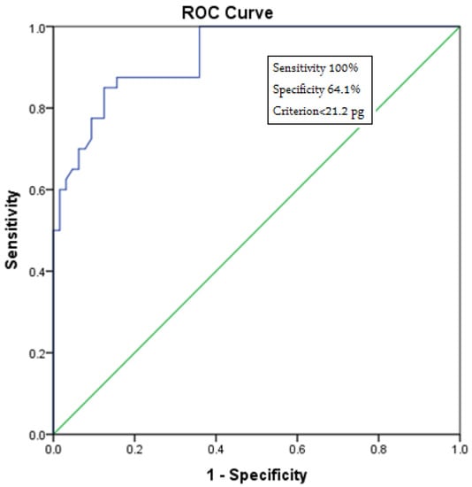 Receiver operating characteristic (ROC) curve analysis for reticulocyte hemoglobin levels in normal individuals and patients with IDA. This figure indicates the cutoff value for Ret-Hb, the lower value of which suggests IDA (cutoff = 21.2 pg) with 100% sensitivity.