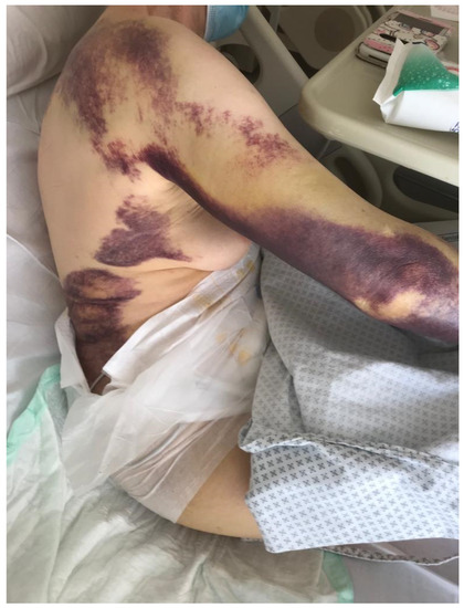 Acquired hemophilia A (AHA) is a rare bleeding disorder in patients with a previously normal hemostasis characterized by the presence of neutralizing autoantibodies named inhibitors, whose target is the coagulation factor VIII (FVIII) [1]. Typically, the incidence of AHA is associated with pregnancy and older age, e.g., over 60 years old [2]. Over 50% of patients with AHA have comorbidities, frequently autoimmune disorders or malignancy [2,3]. The clinical manifestations may range from asymptomatic to life-threatening bleeding, but subcutaneous hematomas are present in 80% of patients and frequently the first sign of the disease [4]. Moreover, especially in the elderly with multiple chronic diseases, the patient’s ongoing medications, i.e., antiplatelet agents and anticoagulants, may interfere with the clinical picture and delay the correct diagnosis [1]. Laboratory investigations lead the diagnostic pathway of AHA and are characterized by prolonged activated partial thromboplastin time (APTT) confirmed with the APTT mixing study, various levels of reduced FVIII activity (usually ranging from <1% to 40%) and the presence of autoantibodies detected by the Bethesda assay or by the enzyme-linked immunosorbent assay [5]. The concomitant presence of a prolonged prothrombin time should be attributed to other causes, e.g., anticoagulants [1]. In elderly patients, morbidity and mortality associated with AHA are extremely high and, unfortunately, because of the rarity of the condition and frequently severe clinical picture at presentation, comparative studies are lacking [1]. Recent international recommendations suggest that both recombinant activated factor VII (eptacog alfa) and activated prothrombin complex concentrate, named bypassing agents, and recombinant porcine factor VIII (Susoctocog alfa), a substitutive therapy, can be administered as the first-line hemostatic treatment options [1]. Because of its lower efficacy and the risk of fluid overload, heart failure and severe hyponatremia, especially in elderly patients, the use of human factor VIII concentrates associated with desmopressin is limited to those cases where therapy with bypassing agents is not available [1,6]. Here, we report a clinical case of AHA in an elderly patient presenting with diffuse subcutaneous hematomas and anemia, successfully treated with Susoctocog alfa.
