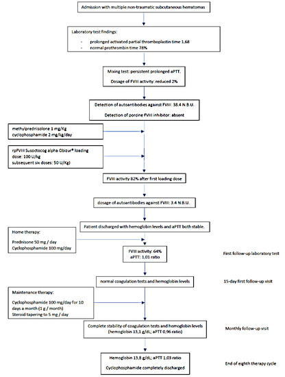 A 79-year-old woman was admitted to the hospital for lipothymia and the presence of non-traumatic subcutaneous hematomas in the four limbs. The medical history showed ischemic heart disease with a six-month-earlier, non-ST-segment elevation myocardial infarction treated with percutaneous angioplasty and stenting, monoclonal gammopathy, hypertension and dislipidemia. The ongoing therapy was Nebivolol 5 mg, acetyl salicylic acid 75 mg, Perindopril 10 mg, Rosuvastatin 20 mg and Furosemide 25 mg bid. Ticagrelor 90 mg was stopped ten days earlier in agreement with the cardiologic follow-up. The physical examination showed hypotension and multiple subcutaneous hematomas at various stages, which were spread to the thighs, legs and arms (Figure 1). The laboratory tests showed worsening moderate-to-severe normocytic normochromic anemia, stage-I acute kidney injury and prolonged activated partial thromboplastin time (aPTT) with normal prothrombin time (PT), 1.68 ratio and 78%, respectively. The serum protein electrophoresis showed the known presence of a minor band in the gamma region (estimated 6%). No Bence Jones proteinuria was found. The patient was treated with multiple red blood cell concentrates and normal saline rehydration. The mixing test showed a persistent, prolonged aPTT thus suggesting the presence of factor inhibitors. Further investigation showed a reduced FVIII activity (2%) with normal activity of FIX, FXI and FXII. According to the international recommendations published in 2020 by Tiede et al. [1], acquired hemophilia A was diagnosed and confirmed with the positive finding of autoantibodies against FVIII detected by the Nijmegen-modified Bethesda assay (38.4 N.B.U.). As recommended, methylprednisolone 1 mg/Kg and oral cyclophosphamide 2 mg/kg/day were started as soon as possible. Accordingly, the presence of porcine FVIII inhibitor was excluded. In order to limit the thromboembolic risk, especially related to the recent cardiac procedure, rpFVIII Susoctocog alpha Obizur® was used as the first-line therapy (loading dose: 100 U/kg; subsequent six doses: 50 U/Kg). FVIII levels were measured immediately before and after the first loading dose, and the results were 5% and 82%, respectively. In a few days, no other subcutaneous hematomas or internal bleeding were noticed, and supportive transfusions were not needed anymore. A further dosage of autoantibodies against FVIII showed a significant reduction (3.4 N.B.U.). When hemoglobin levels and aPTT were persistently stable (12.6 g/dL and 1.06 ratio, respectively), the patient was discharged with an instruction to continue oral prednisone and cyclophosphamide for four weeks. At the first laboratory follow-up visit, FVIII and aPTT were 64% and 1.01 ratio, respectively. At the first follow-up visit, the coagulation tests as well as hemoglobin levels were normal. The patient continued therapy with cyclophosphamide 100 mg and tapered the steroid therapy. At the end of the eighth therapy cycle, given the complete stability of the coagulation tests and hemoglobin levels, cyclophosphamide was completely discharged. A further follow-up visit showed stability of all parameters. Figure 2 summarizes the case report.