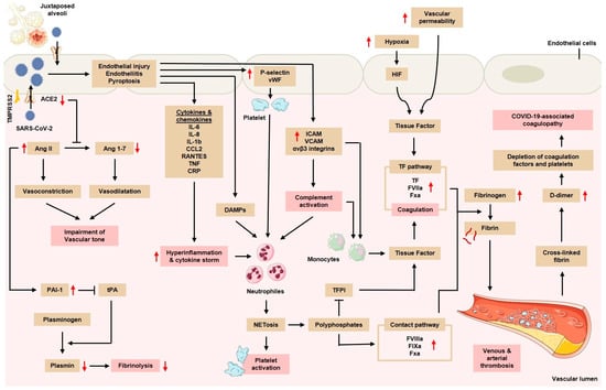 - Bonaventura, A.; Vecchié, A.; Dagna, L.; Martinod, K.; Dixon, D.L.; Van Tassell, B.W.; Dentali, F.; Montecucco, F.; Massberg, S.; Levi, M.; et al. Endothelial Dysfunction and Immunothrombosis as Key Pathogenic Mechanisms in COVID-19. Nat. Rev. Immunol. 2021, 21, 319–329. [Google Scholar] [CrossRef] [PubMed]