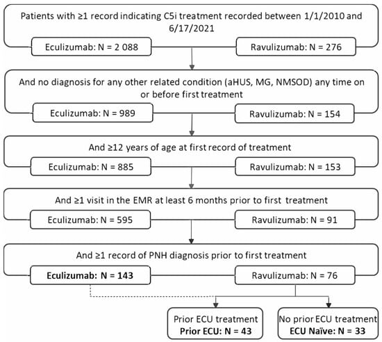 Patients were stratified into three cohorts by C5i treatment history which defined their exposure: ECU, RAV (ECU naïve), and RAV (prior ECU). ECU patients who switched to RAV were included in either the ECU cohort or the RAV (prior ECU) cohort, depending on the analyzed time-window. The ECU population was not further segmented because no patients switched from RAV to ECU. C5i treatment was identified by medication or procedure records in the EMR. Hence, as this study did not utilize prescription claims, it was not necessary to use specific time limits or predefined gaps between each of the C5i administration records.