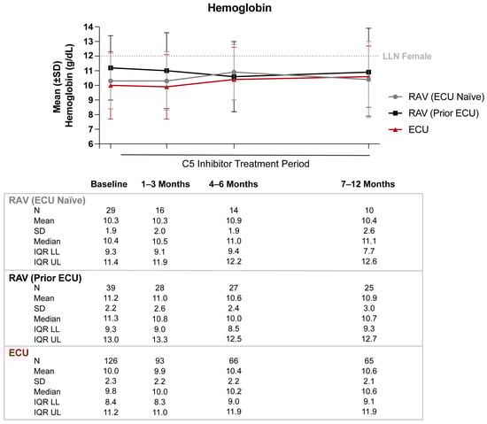 Hemoglobin levels from baseline through 12 months of C5 inhibitor (C5i) treatment. Abbreviations: C5i, C5 inhibitor; ECU, eculizumab; IQR LL, interquartile range lower limit; IQR UL, interquartile range upper limit; LLN, lower limit of normal; RAV, ravulizumab; SD, standard deviation. Note: Mean (±SD) hemoglobin levels were graphed. The LLN for hemoglobin was defined as 12 g/dL.