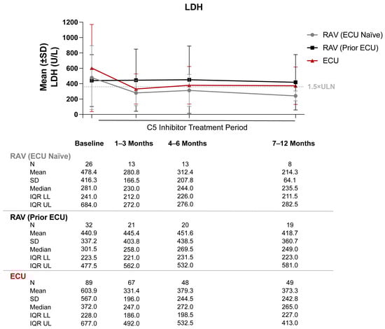 Lactate dehydrogenase (LDH) levels from baseline through 12 months of C5 inhibitor (C5i) treatment. Abbreviations: ECU, eculizumab; IQR LL, interquartile range lower limit; IQR UL, interquartile range upper limit; RAV, ravulizumab; SD, standard deviation; ULN, upper limit of normal. Notes: Mean (±SD) LDH levels were graphed. 1.5 times the ULN for LDH was defined as 360 U/L.
