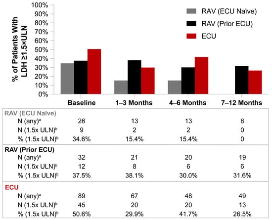 Lactate dehydrogenase (LDH) levels ≥ 1.5 × the upper limit of normal (ULN) from baseline through 12 months of C5 inhibitor (C5i) treatment. Abbreviations: ECU, eculizumab; LDH, lactate dehydrogenase; RAV, ravulizumab; ULN, upper limit normal. Notes: 1.5 times the ULN for LDH was defined as 360 U/L. Due to the small sample sizes, significance testing was not conducted for the analyses, and descriptive analyses were used for comparisons. For a more detailed analysis of LDH, refer to the BTH analysis in Table 3. a Number of patients with at least one test during the time period of interest. b Number (%) of patients with at least one test result 1.5 times above the ULN.