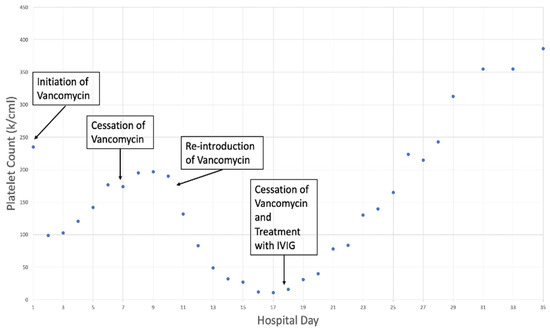 The patient was initiated on vancomycin on admission for broad spectrum antimicrobial coverage, which was subsequently discontinued on day 7. Upon the re-introduction of vancomycin on day 10, the platelet count abruptly decreased to a nadir of 11 k/mcl. The vancomycin was discontinued on day 17 with concomitant IVIG treatment and the subsequent resolution of thrombocytopenia.