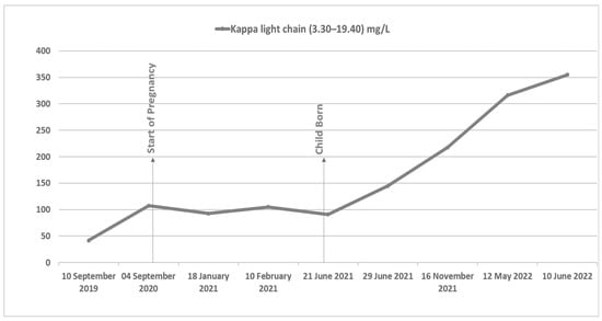 A graph of Serum Kappa light chain levels from 10 September 2019 (12 months prior to onset of pregnancy) to 10 June 2022 (12 months post-delivery).